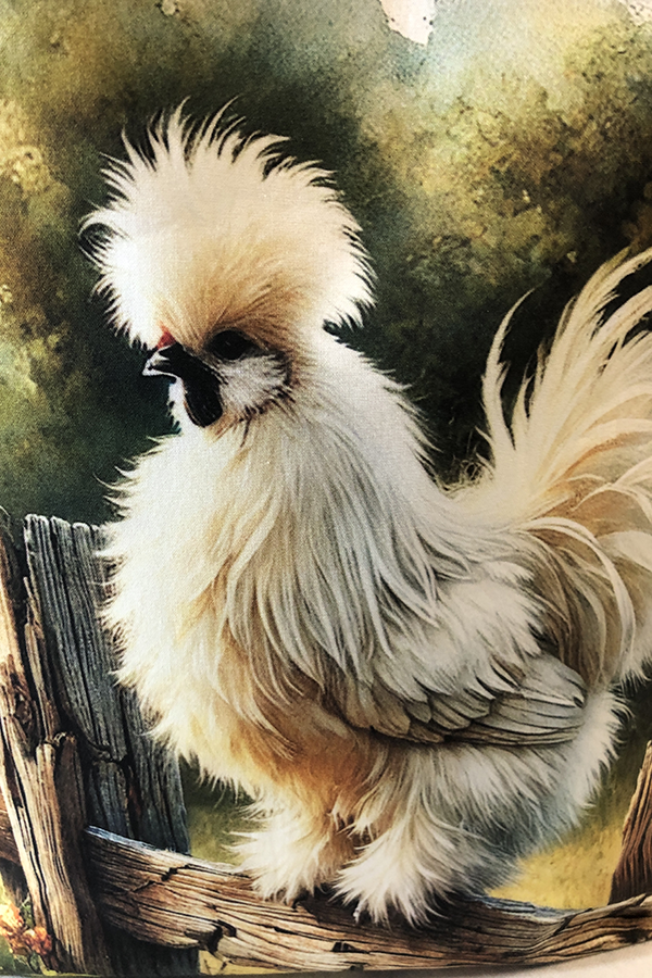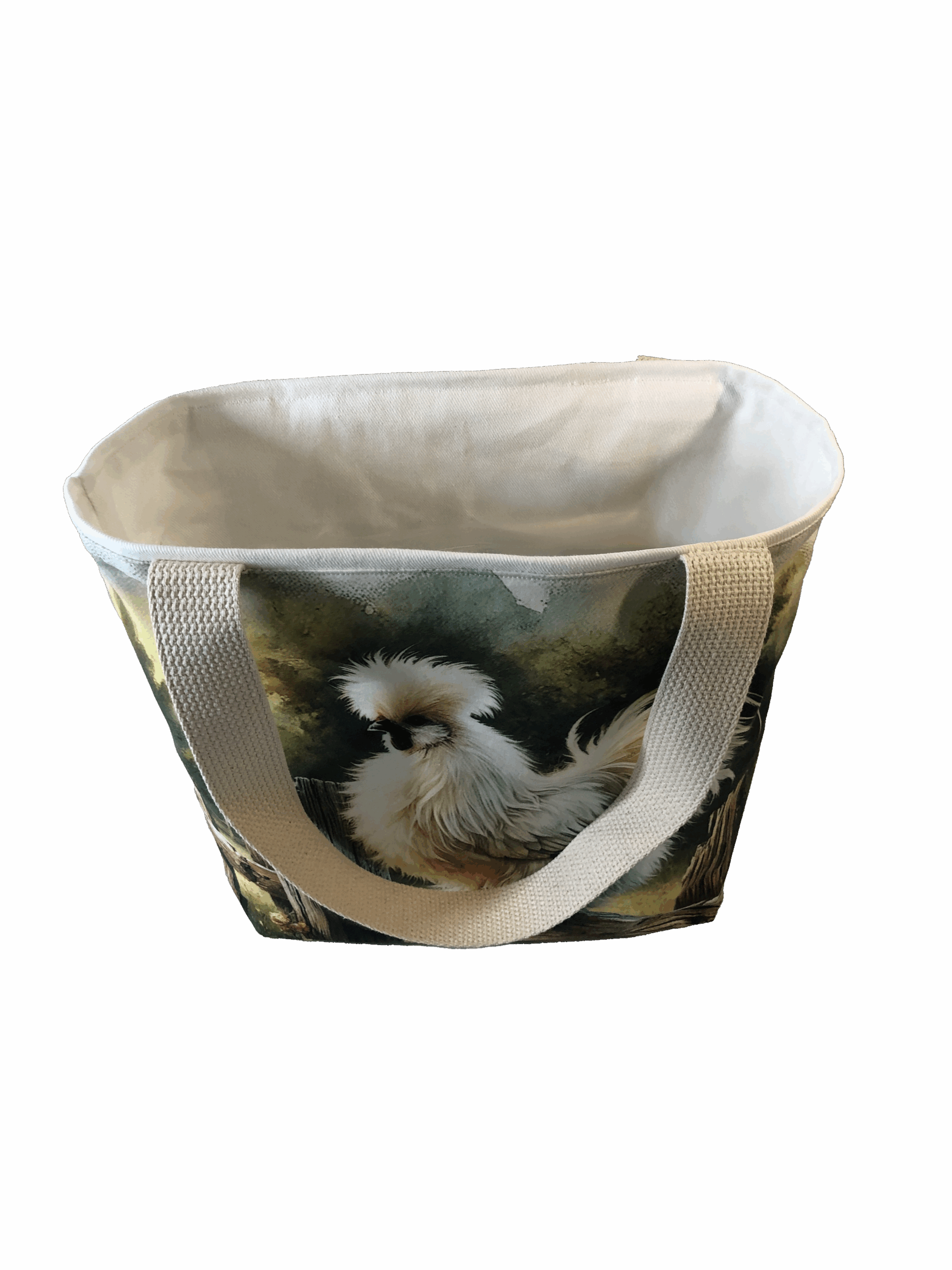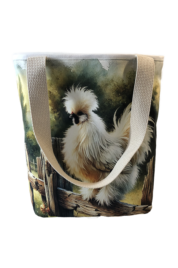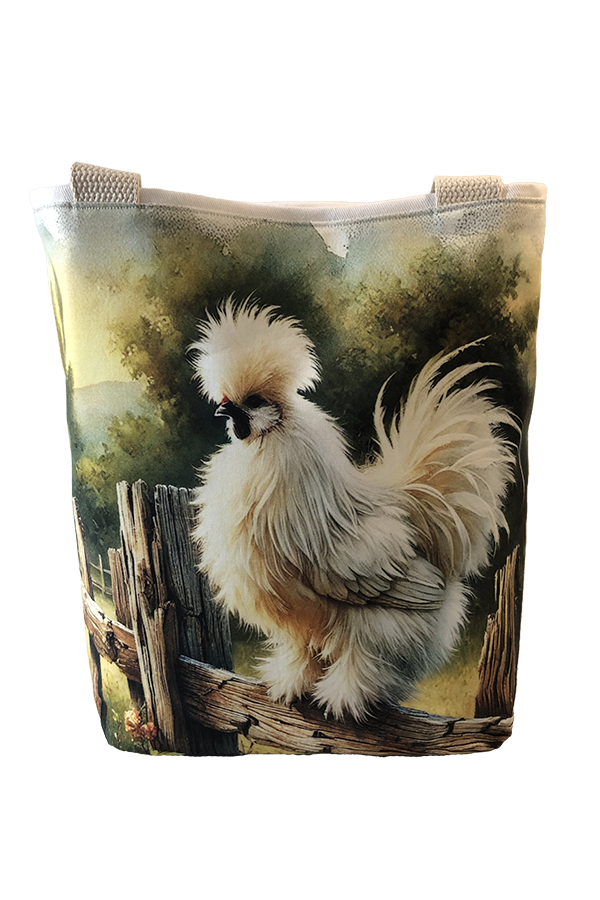 Crafted meticulously, this Handmade Designer Silkie White Fence tote bag showcases a picture of a majestic show chicken, capturing its elegance and vibrant plumage in stunning detail. The design is printed on an all-cotton outer layer, which is durable and lends a soft, luxurious feel to the bag. The outer fabric is carefully selected to ensure the striking image remains vibrant and eye-catching, making the tote a conversation starter wherever you go.