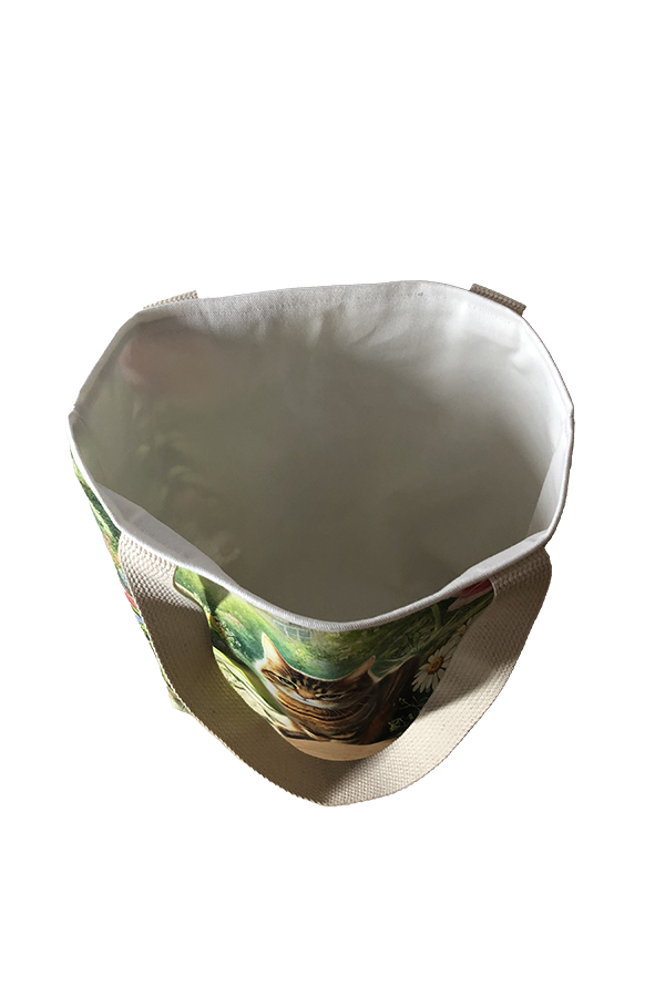 The fabric showcases the beauty of your pet in a relaxed pose, artfully rendered to capture the unique personalities of our beloved feline friends. The print’s vibrant colors and intricate details make this tote a standout accessory, sure to turn heads wherever you go. The interior of This Handmade Designer Tabby Brown Garden Tote Bag is lined with heavy cotton twill, providing a robust and durable foundation that maintains the bag’s shape and integrity. This high-quality lining not only adds to the bag’s durability but also offers a soft, luxurious feel, ensuring your belongings are well-protected.