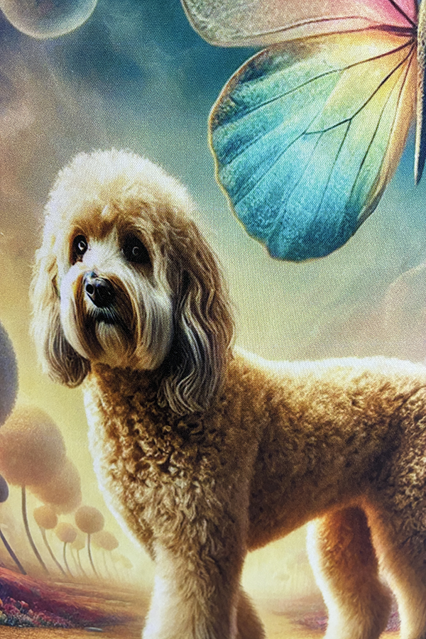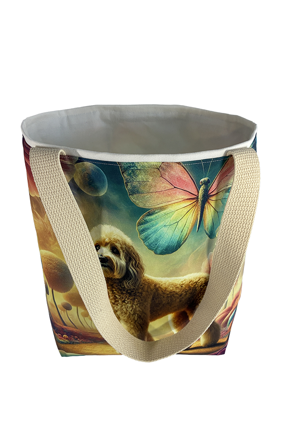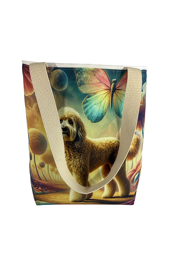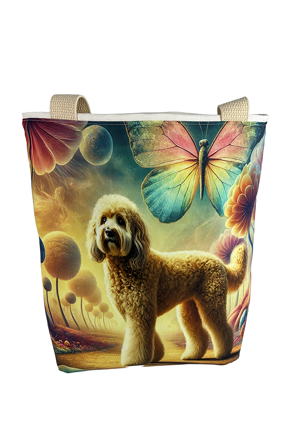 Introducing the epitome of canine elegance and artisan craftsmanship: the Handmade Designer Whoodle Surrealism Tote Bag. Standing proud at 14 inches tall and stretching 16 inches wide, this exquisite accessory is a tribute to functionality and style. Crafted with meticulous attention to detail, it will become your wardrobe’s darling. At first glance, your eyes are immediately drawn to the captivating design gracing the tote’s exterior. Your pet is displayed in a beautiful scene with personality and charm. Their playful demeanor brings a touch of whimsy to the bag, making it a conversation starter wherever you go.