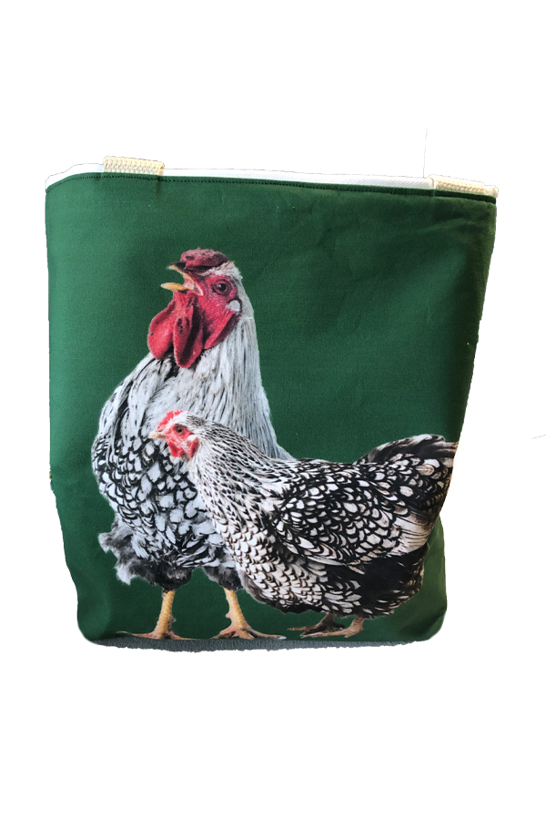 Crafted meticulously, this handmade designer Wyandotte #1 Green tote bag showcases a picture of a majestic show chicken, capturing its elegance and vibrant plumage in stunning detail. The design is printed on an all-cotton outer layer, which is durable and lends a soft, luxurious feel to the bag. The outer fabric is carefully selected to ensure the striking image remains vibrant and eye-catching, making the tote a conversation starter wherever you go.