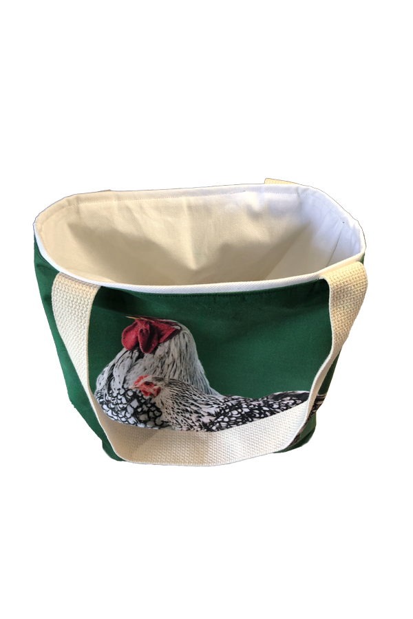 Inside, the handmade designer Wyandotte #1 Green  tote features a heavy cotton twill inner layer, providing additional strength and resilience. This sturdy material ensures that the bag can handle your daily essentials with ease, from books and groceries to gym gear and beach towels. The inner layer is designed to withstand wear and tear, so you can rely on this tote for years to come.