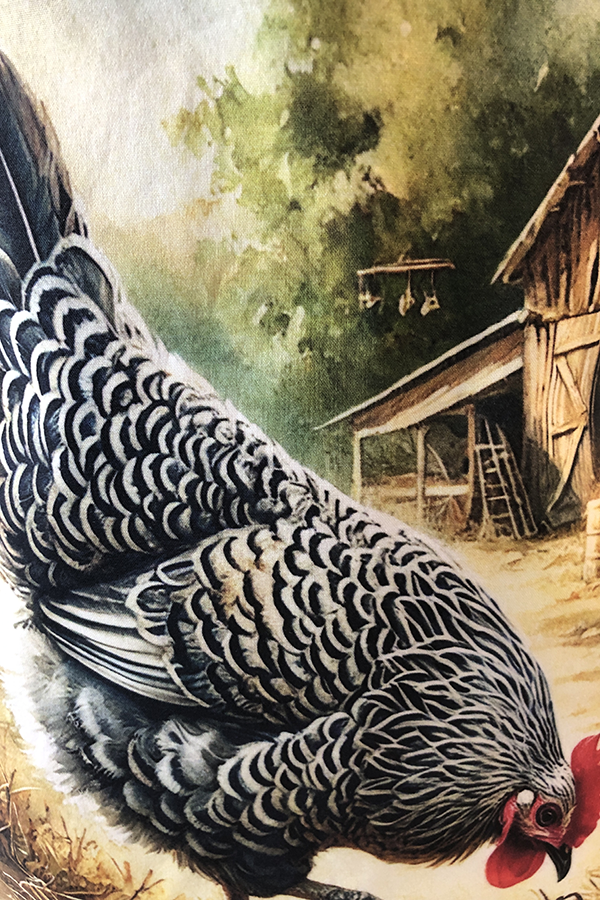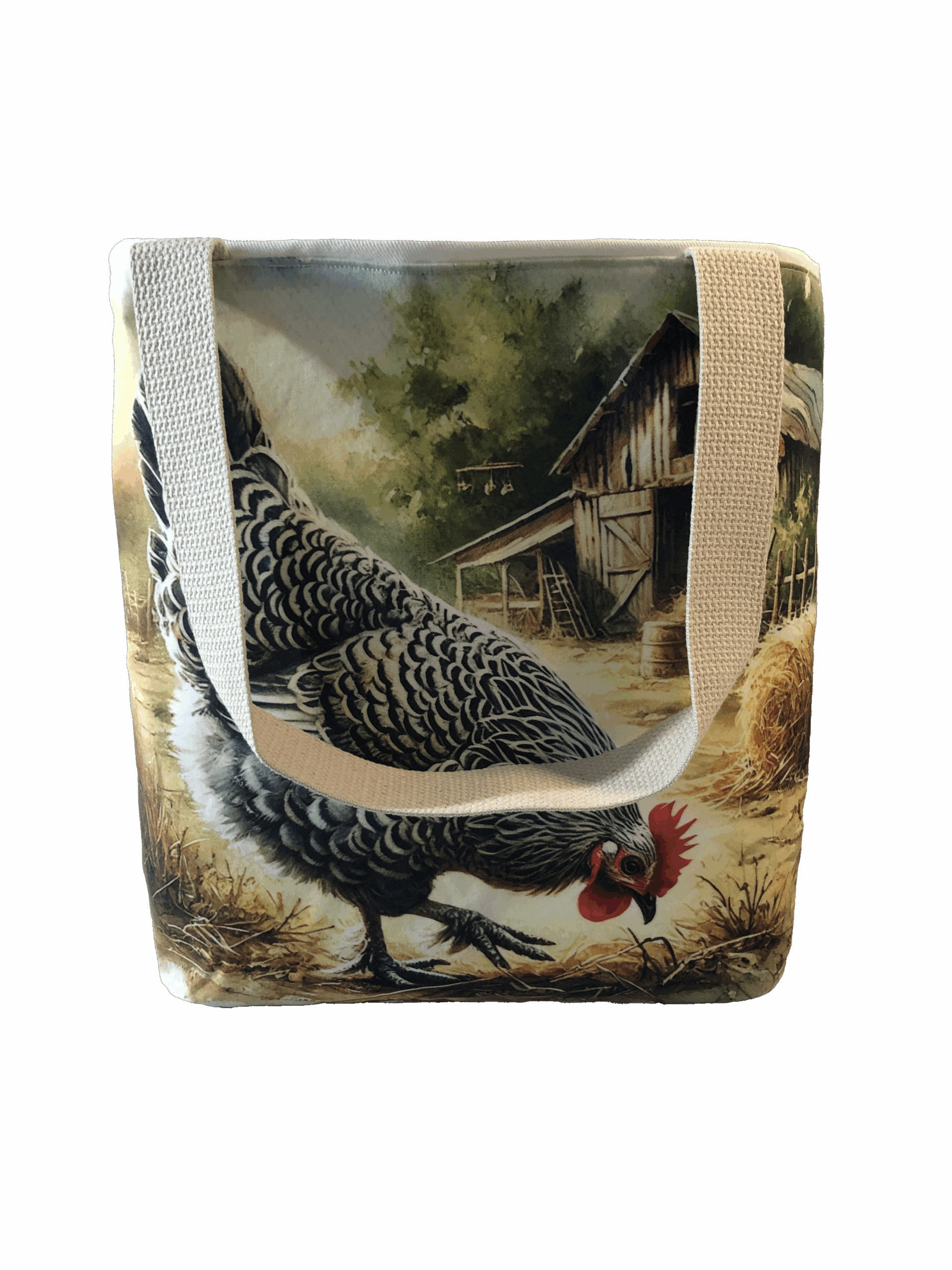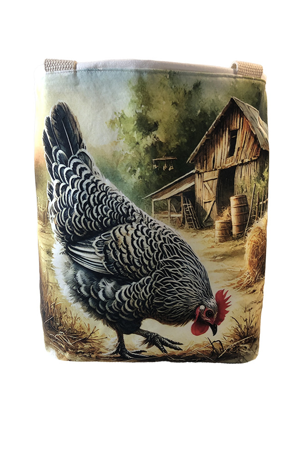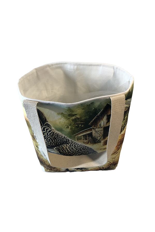 Crafted meticulously, this Handmade Designer Wyandotte Feeding tote bag showcases a picture of a majestic show chicken, capturing its elegance and vibrant plumage in stunning detail. The design is printed on an all-cotton outer layer, which is durable and lends a soft, luxurious feel to the bag. The outer fabric is carefully selected to ensure the striking image remains vibrant and eye-catching, making the tote a conversation starter wherever you go.